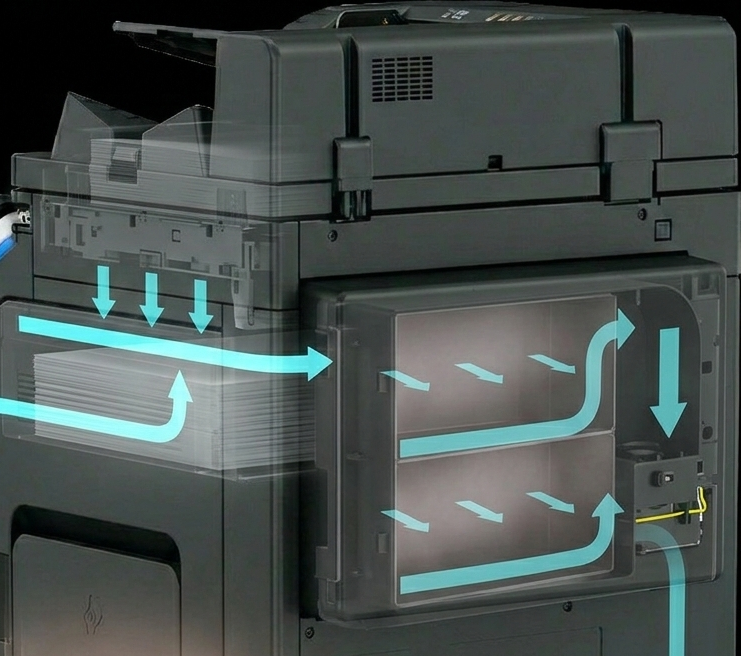Le ventole sono attive solo durante il processo di stampa e garantiscono un flusso d'aria ottimizzato. Il condotto dell'aria aiuta a dirigere il flusso d'aria dalla zona di fusione all'unità filtro. Qualsiasi rischio di surriscaldamento o di fuoriuscita di emissioni da altre parti del sistema dell'ufficio vengono eliminati.
